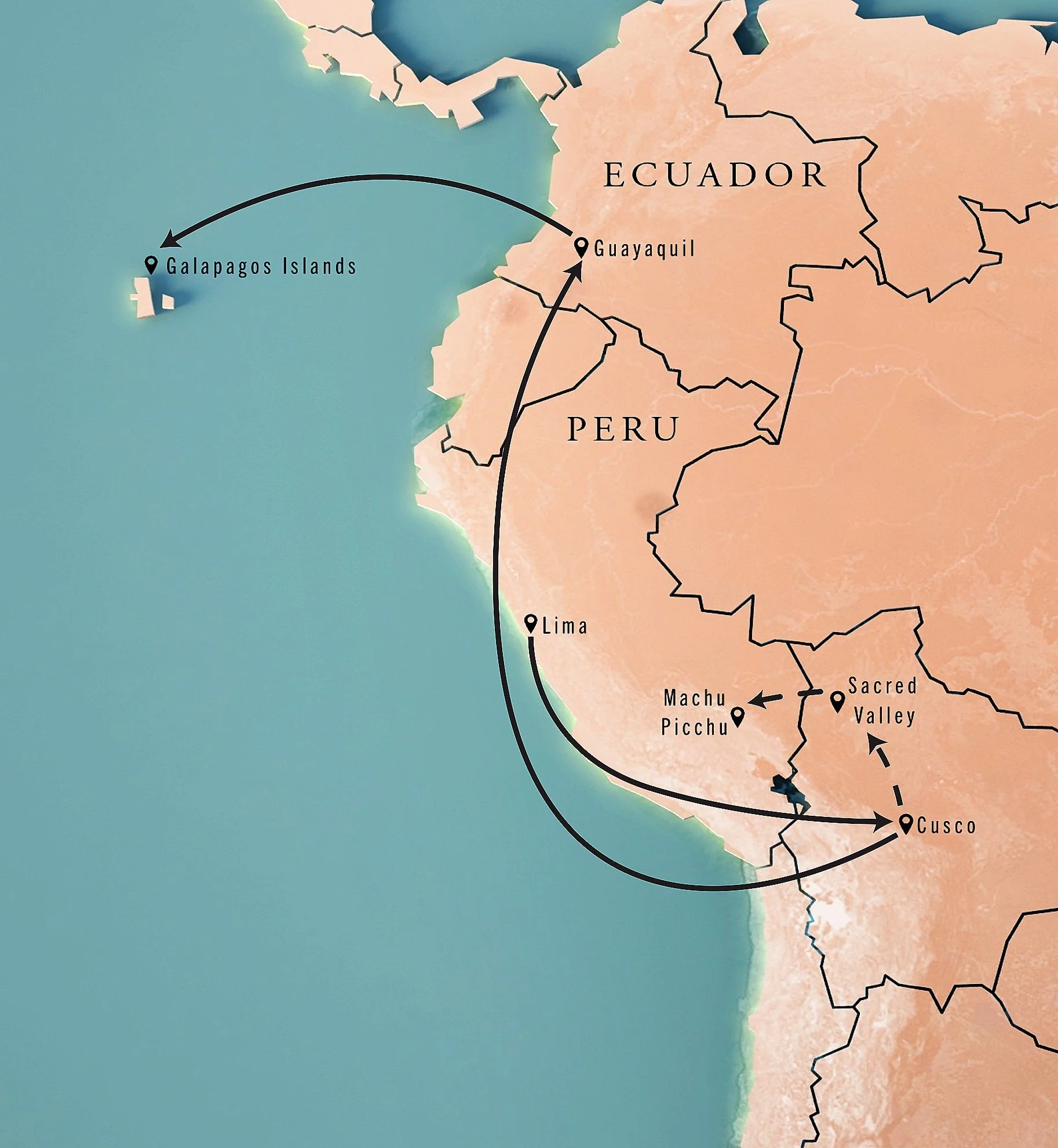 Experience an extraordinary adventure by combining the breathtaking wonders of the Galapagos Islands and Machu Picchu. Your journey begins in Peru, where you'll embark on a private guided tour of Lima, immersing yourself in the rich history and culture of both the Incan and colonial Spanish eras. Continue to the ancient capital of Cusco and explore the impressive ruins of Sacsayhuaman and Puca Pucara. Then, enjoy a scenic ride aboard a glass-ceiling train to the majestic Machu Picchu, nestled in the Andes, where a private guide will unveil its mysteries.