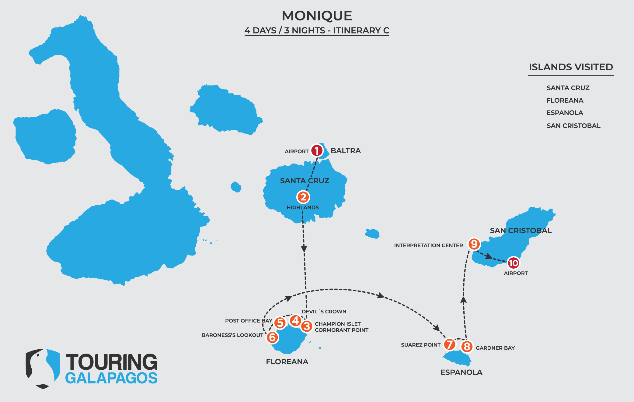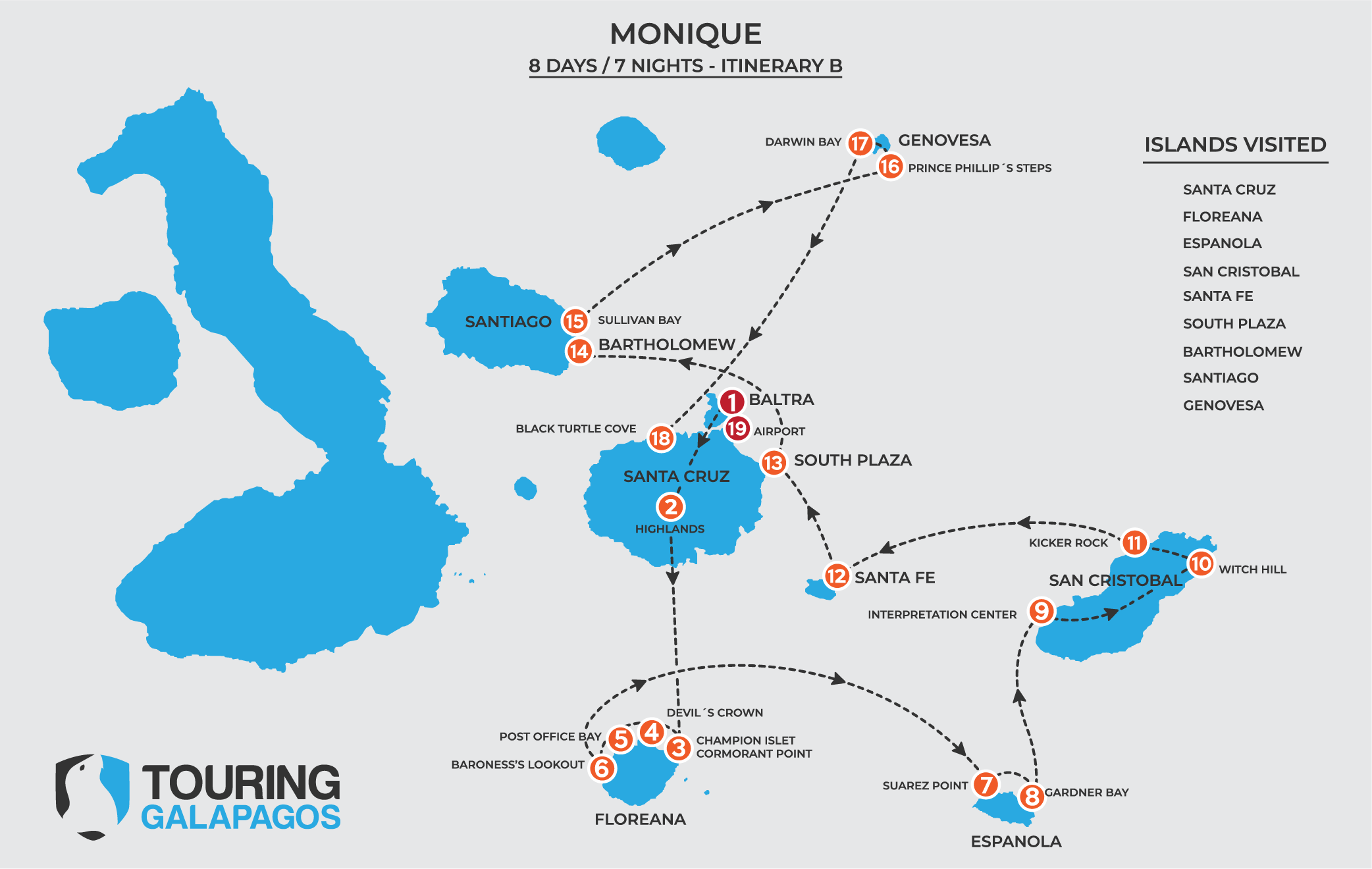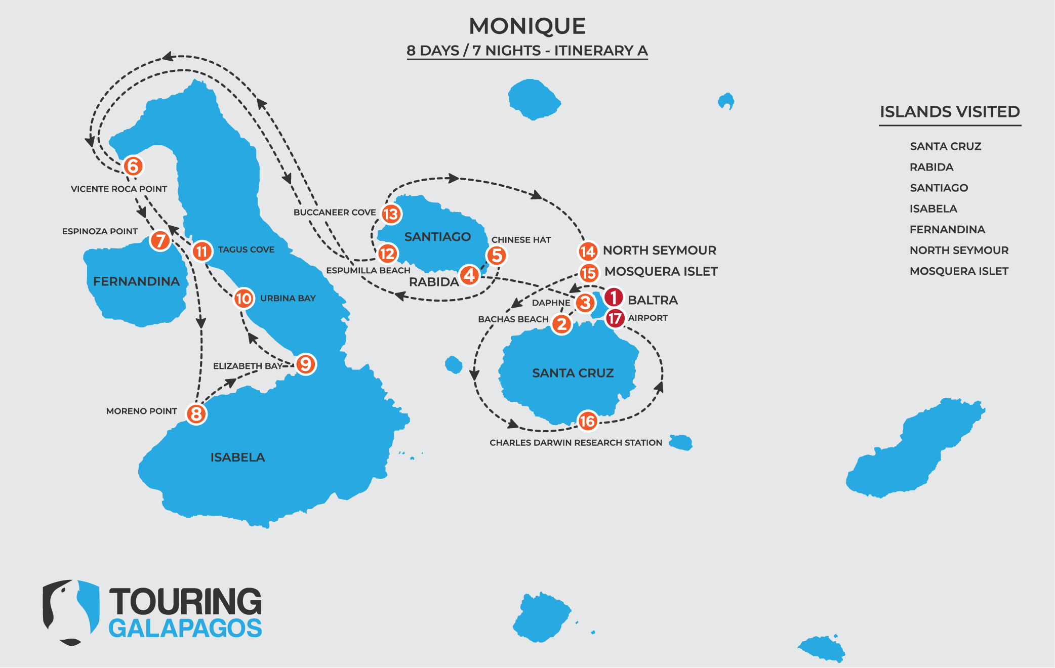 Designed for discerning travelers, the Monique blends modern comfort with sustainable practices to ensure a refined yet responsible voyage. Discover secluded coves, pristine beaches, and wildlife-rich ecosystems while enjoying signature hospitality. Every day unveils a new adventure—from the birdlife of North Seymour to the volcanic formations of Sullivan Bay—creating a journey as enriching as it is unforgettable.